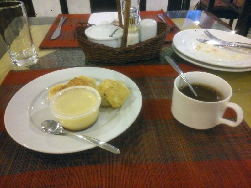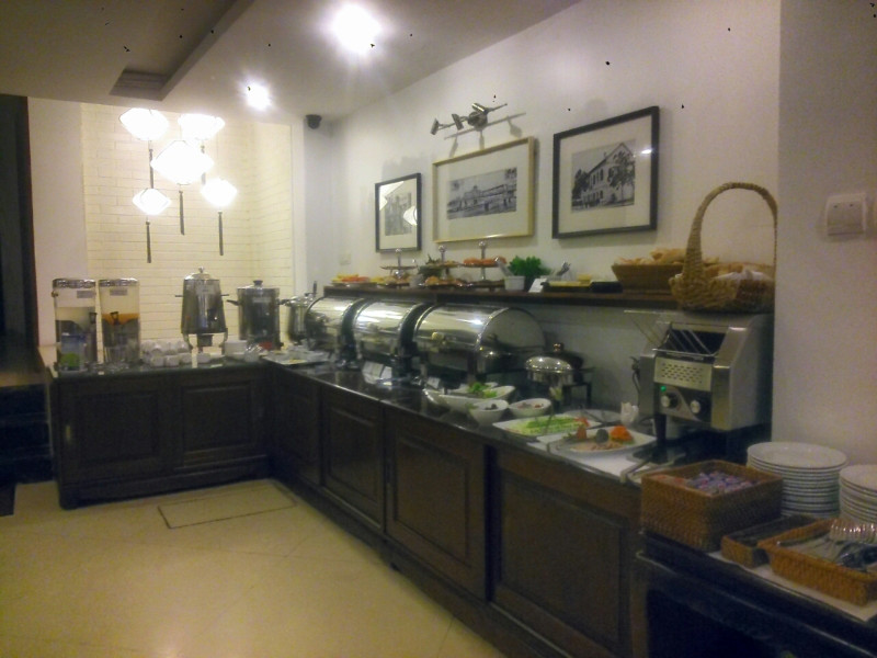 高級そうな普通のホテルですが、外にメニューが置かれていたので、食事だけでもできるか聞いたところ、朝のビュッフェはUSD6.00とのこと。